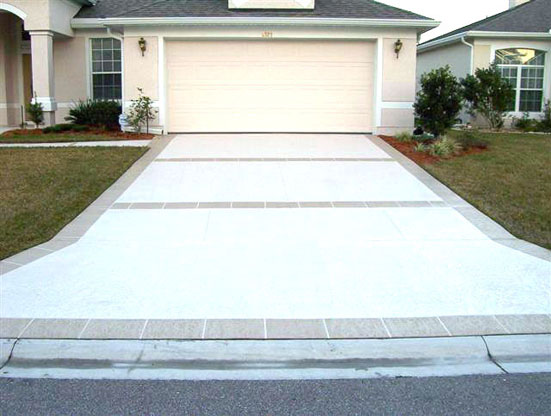 This is the original drive way after resurfacing. The driveway was tinted a bright white and gray brick was added around the edges.